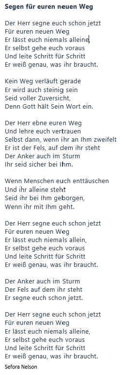 Mit diesem (leicht abgewandelten) Lied haben wir Monika und Uli Tropp am vergangenen Sonntag (19. April 2026) nach Sittensen in Norddeutschland verabschiedet.